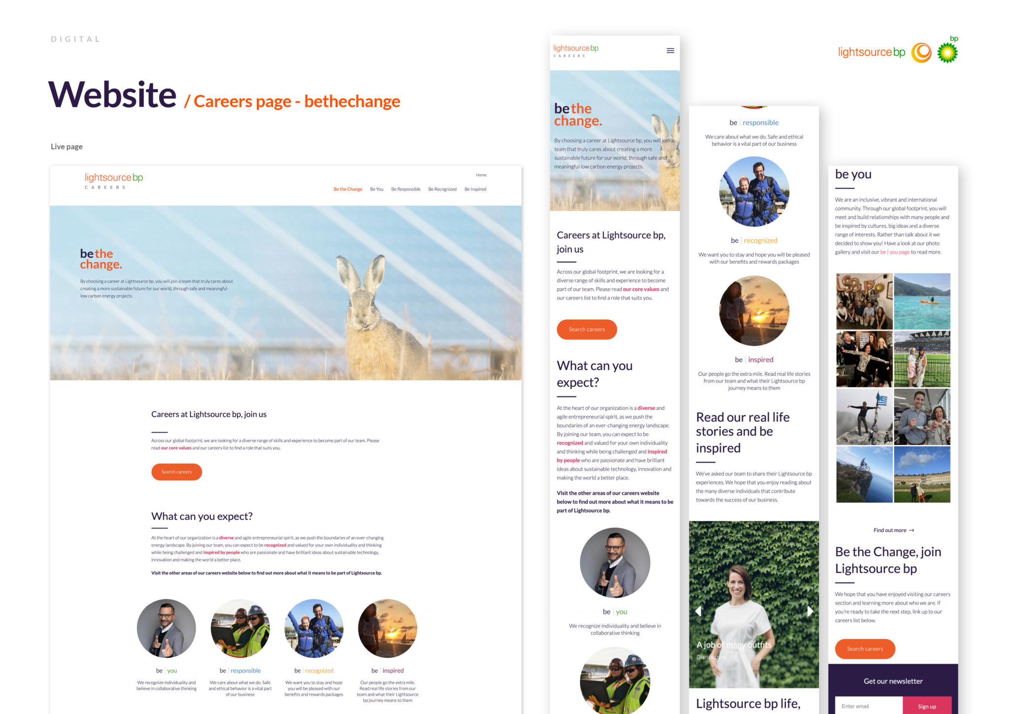 During my time at Lightsource bp, I worked across a broad portfolio of projects, ranging from everyday brand and marketing design to large-scale strategic initiatives. These included the company’s Sustainability drive, the “Be The Change” recruitment campaign, and digital product work for the Tribe App, developed under LSBP Labs (the company’s technology and innovation arm).